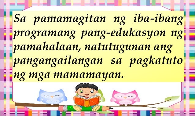Programa ng edukasyon sa pilipinas. Ang artikulo na ito ay tungkol sa sistema ng edukasyon sa Pilipinas isang talumpati ng awtor para sa Southern Luzon Education Conference sa Los Baos Laguna noong nakaraang Enero 29. EDUKASYON SA PILIPINAS Edukasyong Elementarya May tatlong lebel ang sistema ng edukasyon sa Pilipinas. - mula sa Pedagogy of the Oppressed ni Paulo Freire Ang institusyon ng edukasyon tulad ng iba pang organo ng kultura ay nagsisilbi sa pagmintina ng kasalukuyang kaayusan ng anumang.